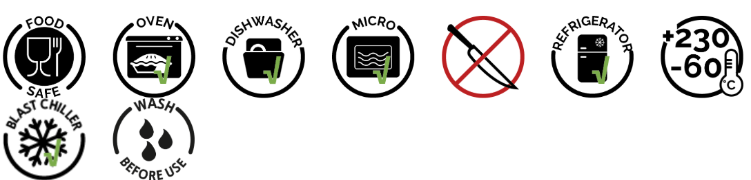 Adatto all’uso in abbattitore e in forno fino a temperature che variano da -60°C (-76°F) a + 230°C (+450°F).