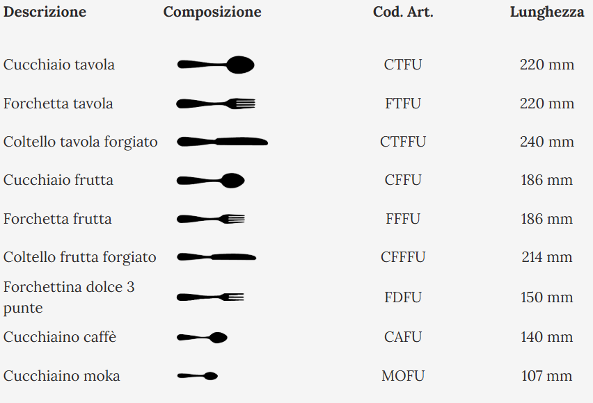 Set posate in Acciaio Inox 18-C NICKEL FREE. Finitura lucida. Spessore 3 mm.
